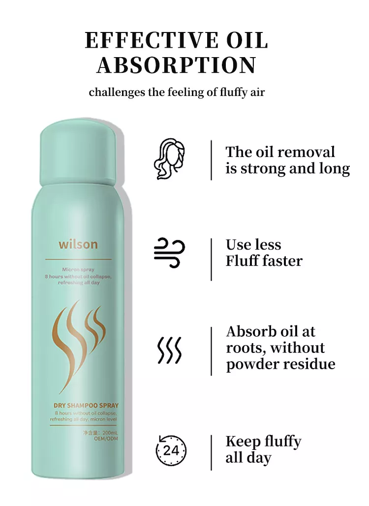 لقد أنقذ رذاذ الشامبو الجاف البارد بدون غسل من ويلسون العديد من رؤوس الزيت التي تخرج مؤقتًا ولا يمكن غسل مشكلة الشعر، المادة الخام الرئيسية هي نشا الأرز، والنشا له بنية مسامية، والامتزاز، وهي مادة خام شائعة لامتصاص الرطوبة، ويمكن أن تمتص بشكل فعال الزيت الزائد على فروة الرأس وتنظيف أوساخ الشعر، والرش وإضافة بعض المكونات السطحية والكهروستاتيكية لتسهيل إزالة المنتجات من الشعر. اشعري بالانتعاش والطبيعية بعد الاستخدام.