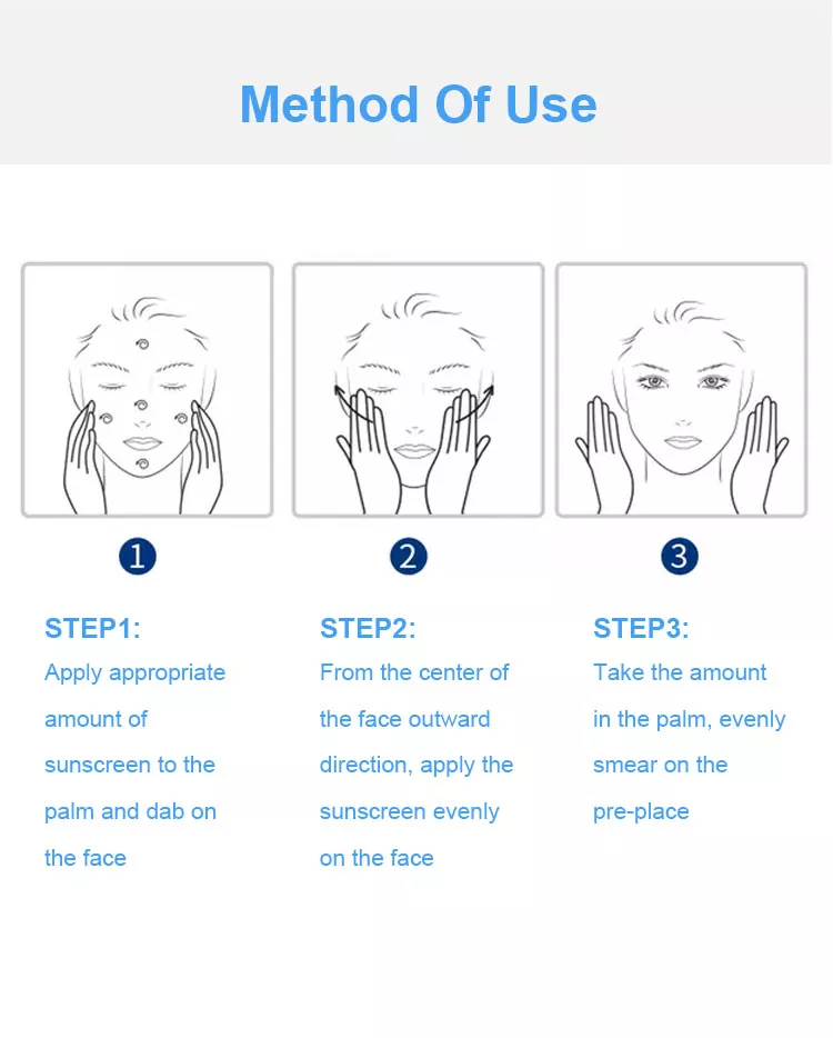 يجب وضع واقي الشمس قبل 30 دقيقة من الخروج للحصول على تأثيره الكامل. أثناء الأنشطة الخارجية، يجب إعادة وضع واقي الشمس كل ساعتين للحفاظ على تأثير الحماية من الشمس.